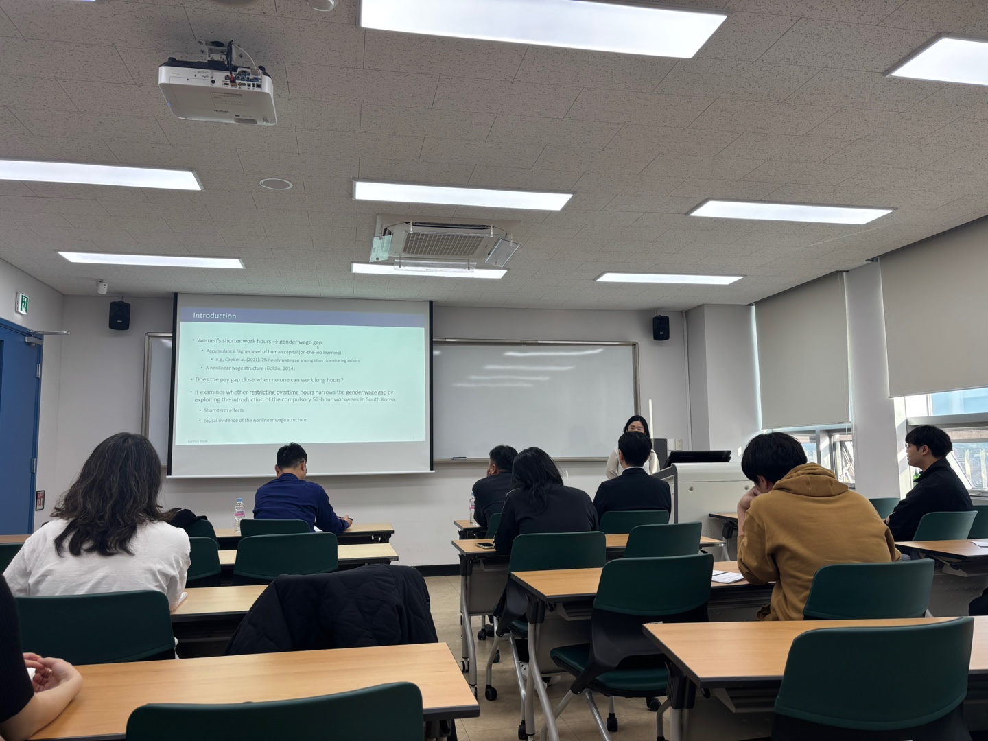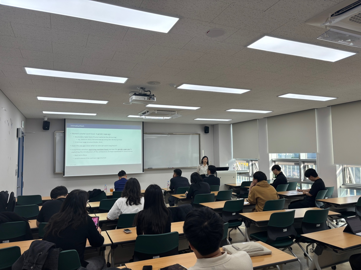 경제정책학전공의 SSK 사업단( Center for Artificial Intelligence and Aging Study (CASS))에서는 한국노동연구원 LKI의 곽은혜 연구위원님 모시고 "Effects of Restricting Overtime Hours on the Gender Pay Gap."라는 주제의 세미나를 진행하였습니다.
